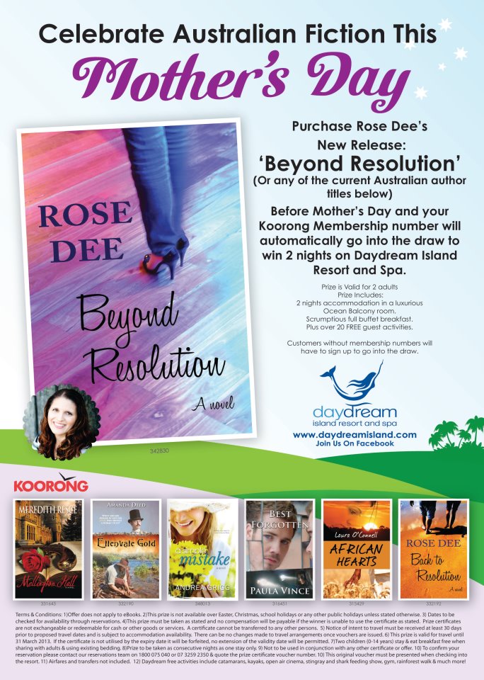 Koorong’s First Online Launch. On April 24, 2012 By Rose DeeIn Uncategorized Please jump on link below and support my online launch with Koorong. Purchase my new release ‘Beyond Resolution’ to go into the draw to win 2 nights on Daydream Island Resort and Spa. (conditions apply) Things to see on the launch page; Trailer to ‘Beyond Resolution’. Interview with Caleb winner Paula Vince. http://www.koorong.com/estore/rosedee.html http://www.daydreamisland.com/ Share this: Click to share on Facebook (Opens in new window) Facebook Click to email a link to a friend (Opens in new window) Email Like Loading...